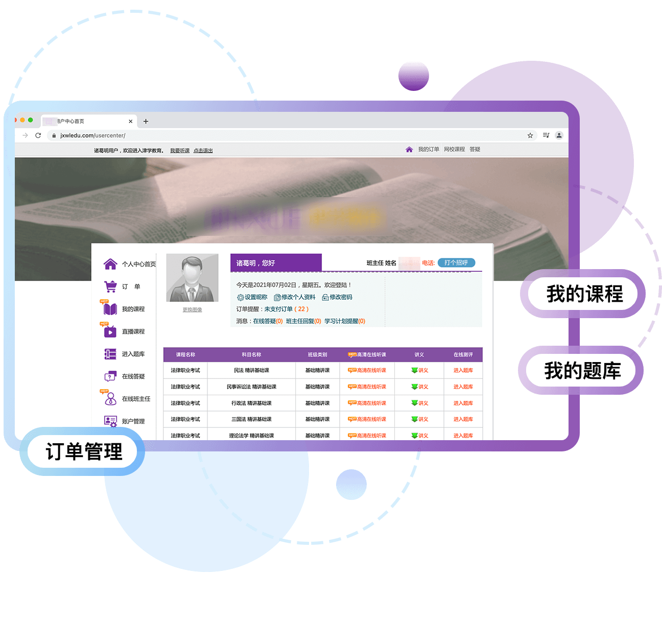 学员可以查看以及管理自身的学习状态及数据,“我的课程”,“我的直播”,“学习记录”,“我的订单”,“收货地址”,“在线题库”,“意见反馈”等功能的提供,让学员轻轻松松掌握自己的学习动向。